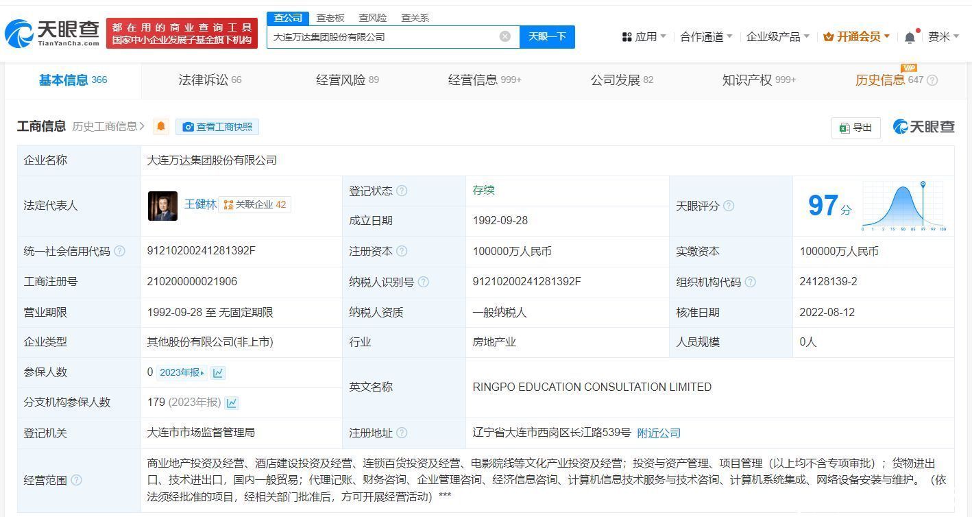 大连万达集团股份有限公司成立于1992年9月,法定代表东说念主为王健林,注册成本10亿东说念主民币,方针畛域包括营业地产投资及方针、旅店建树投资及方针、连锁百货投资及方针等,由大一语气兴投资有限公司、王健林共同捏股。风险信息知道,该公司现有多条被扩充东说念主及股权冻结信息。